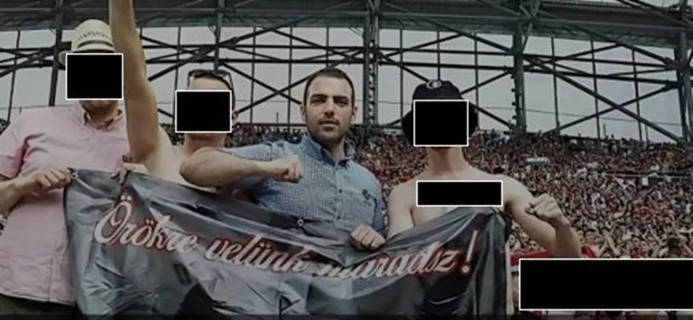 egy karját náci üdvözlésre lendítő illető társaságában szurkol – egy jellegzetes ingben.