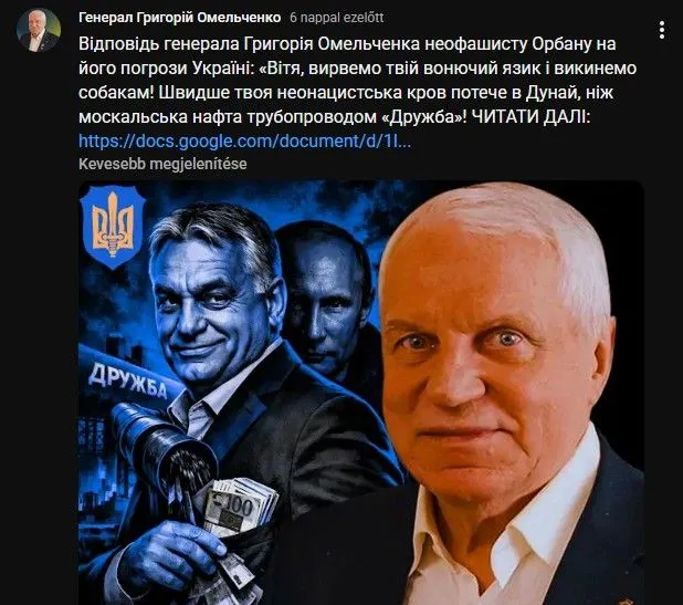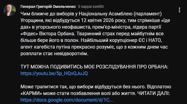 Hrihorij Omelcsenko, az Ukrán Biztonsági Szolgálat (SZBU) egykori tábornoka fenyegető kijelentéseket tett Orbán Viktorról és családjáról. A Pryamy TV nevű YouTube-csatornára feltöltött felvételen azt mondta: „Tudjuk, hol lakik, hol tölti az éjszakát, hol iszik sört vagy bort, hol vízipipázik, hová jár, kikkel találkozik és így tovább” - számolt be róla a Mandiner.