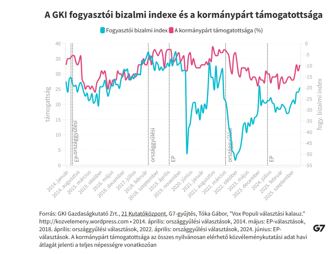 A lakosság gazdasági helyzetértékelése alapjaiban határozza meg egy kormány újraválasztásának esélyeit. Alapjáraton a fogyasztói bizalom esése a hatalmon lévő párt népszerűségének eséséhez vezet, a gazdasági várakozások javulása pedig emeli a kormánypárt támogatottságát − írja a Telex/G7.