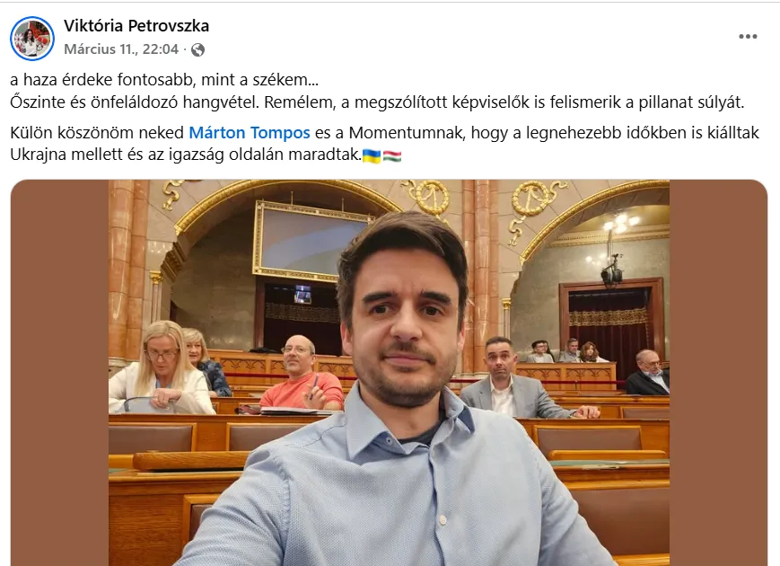 – mondta a március 15-i Tisza-meneten ukrán nyelvű videós bejelentkezésében Petrovszka Viktória, az Egység magyarországi ukrán egyesület elnöke, aki emellett a Fővárosi Ukrán Nemzetiségi Önkormányzat elnöke is, továbbá az Ukrán Országos Önkormányzat képviselője és a pénzügyi bizottság tagja.