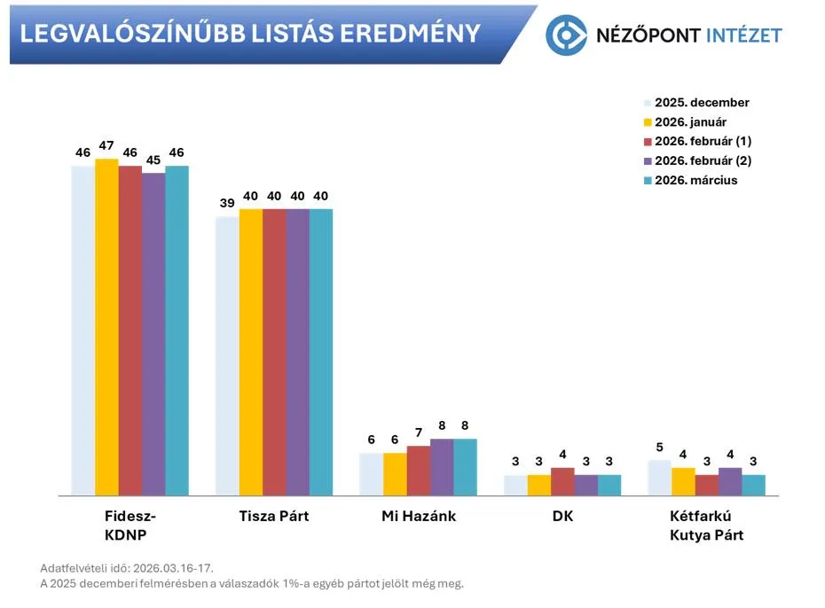 A mozgósításra és a napirendre vezethető vissza, hogy a kormánypártok enyhén növelték előnyüket. A Fidesz-KDNP legvalószínűbb listás eredménye április 12-én 46, a Tisza-lista eredménye 40 százalék lehet a Nézőpont Intézet felmérése szerint. A „legvalószínűbb listás eredmény” meghatározása során az összes aktív pártválasztó bevallott és a többi aktív választó statisztikai módszerekkel beazonosított véleményét vettük figyelembe.