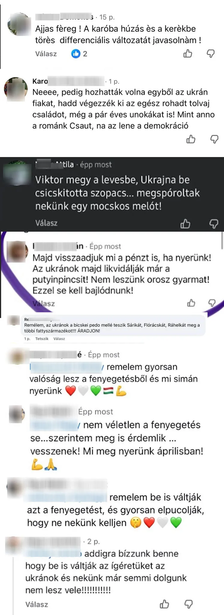 Mindezek mellett pedig annak örvendeznek, hogyha jönnek az ukránok, akkor helyettük elvégzik a „piszkos melót", illetve van olyan is, akik még a pénzüket is odaadnák azért, ha valaki meggyilkolná az Orbán-családot.