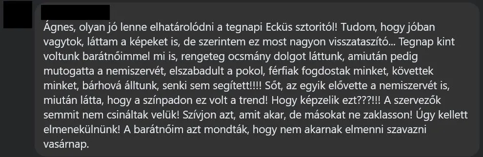 Nem akar csitulni a pénteki „rendszerbontónak” titulált koncerten történt közszeméremsértés körüli botrány. A Hősök zenekar frontembere, Eckü heremutogatása nemcsak a fideszes, illetve a bizonytalan választóknál, de jó érzésű Tisza-szavazóknál is kiverte a biztosítékot, és sokan a közösségi médiában kérik számon az ellenzéki politikusokat a gyomorforgató eset miatt - részletezte a Mandiner.