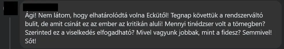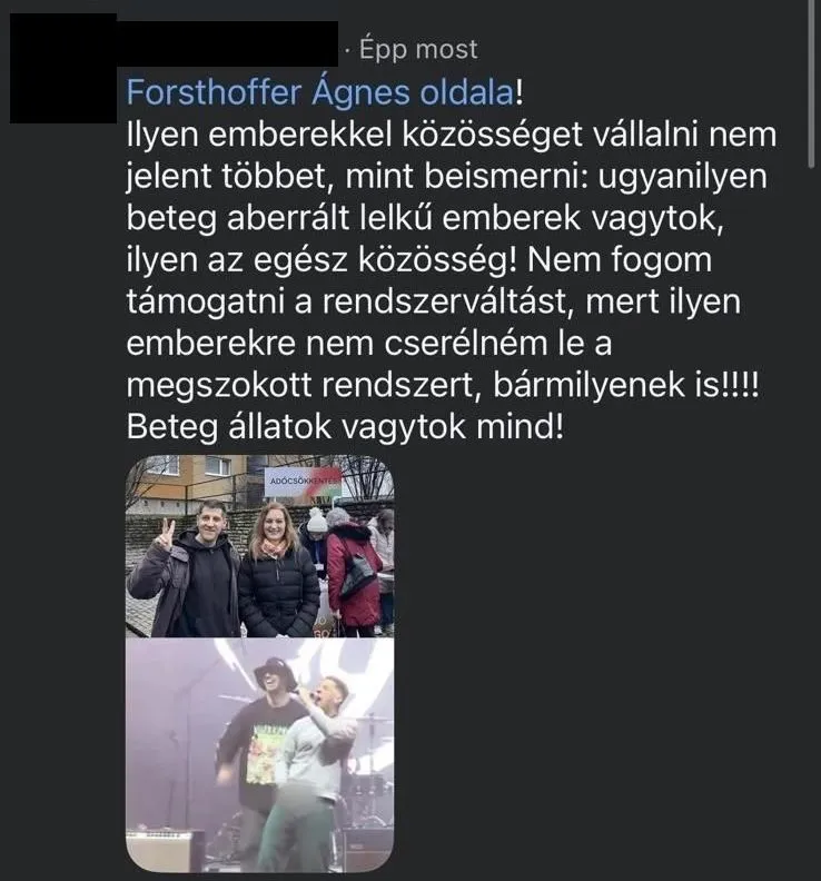 – ezt a felháborodott kommentet egy Tisza-logós profilképpel szereplő hozzászóló hagyta Forsthoffer Ágnes egyik Facebook-bejegyzésénél, csatolva az elfogadhatatlan, obszcén gesztust produkáló zenésszel közösen kampányoló Tisza-alelnökről készült fényképet.