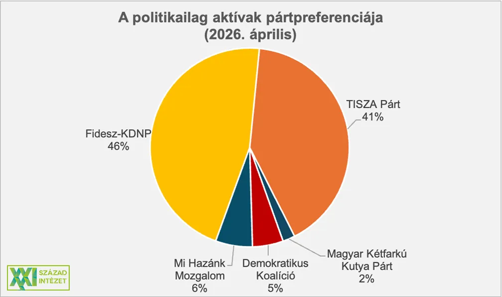 XXI. Század Intézet legutóbbi adatfelvétele óta az egymással versenyt futó két nagy párt erőviszonyaiban nem történt érdemi változás: a Fidesz 46 százalékon áll, a Tisza 41-en. Abban sincs változás, hogy a Mi Hazánk változatlanul a parlamenti küszöb felett, 6 százalékon teljesít.