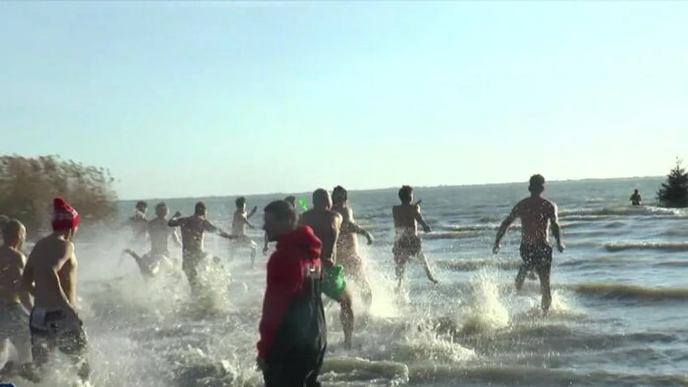 Jelmezekben fürödtek a jeges Balatonban