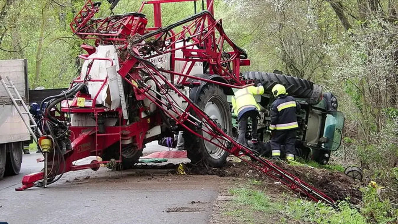 Permetező traktor borult az árokba